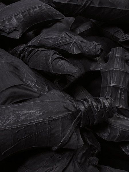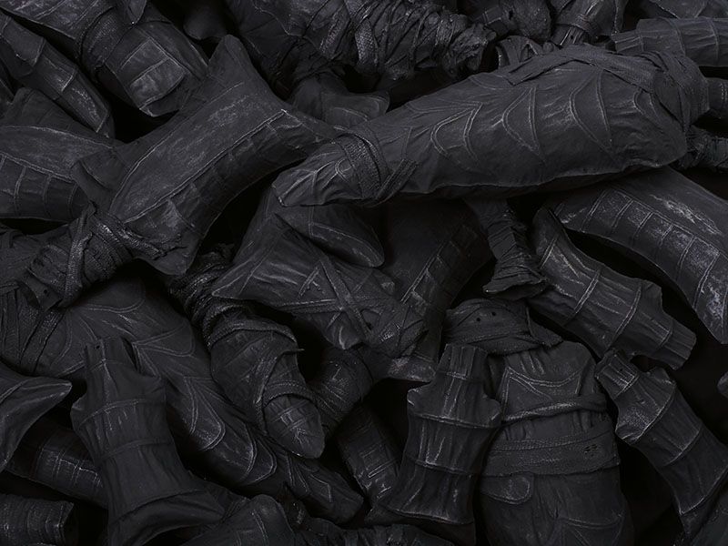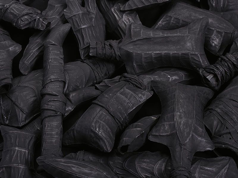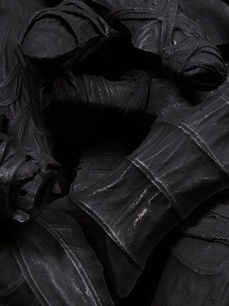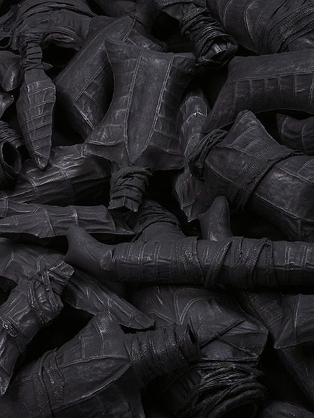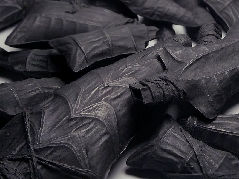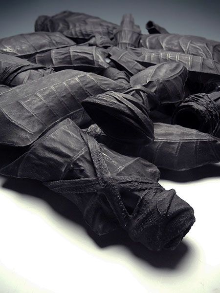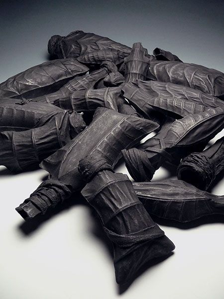 The Salient Dead is rendered in earthenware, from the material that is the land we fight over, the land under us at the time of birth which dictates and classifies our rights, yet ultimately unites us in death. It explores a landscape of manmade death that unifies the humanity of the hand with the metamorphosis of man into weapon.